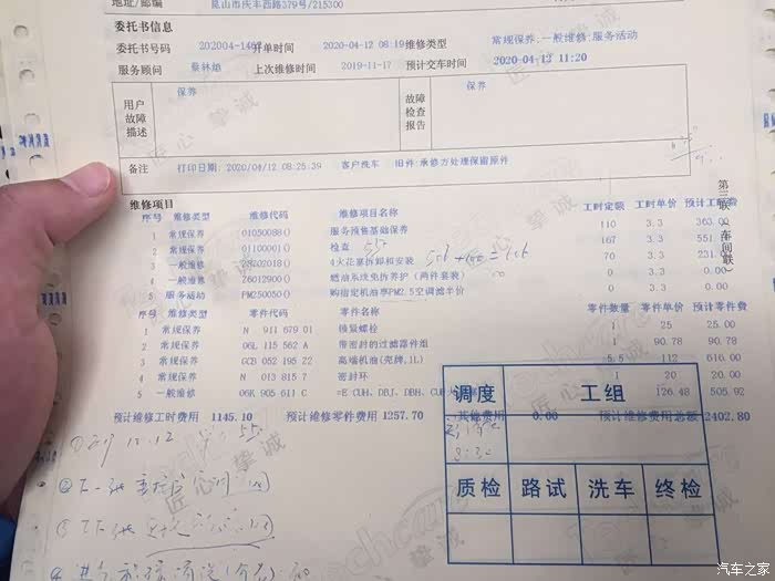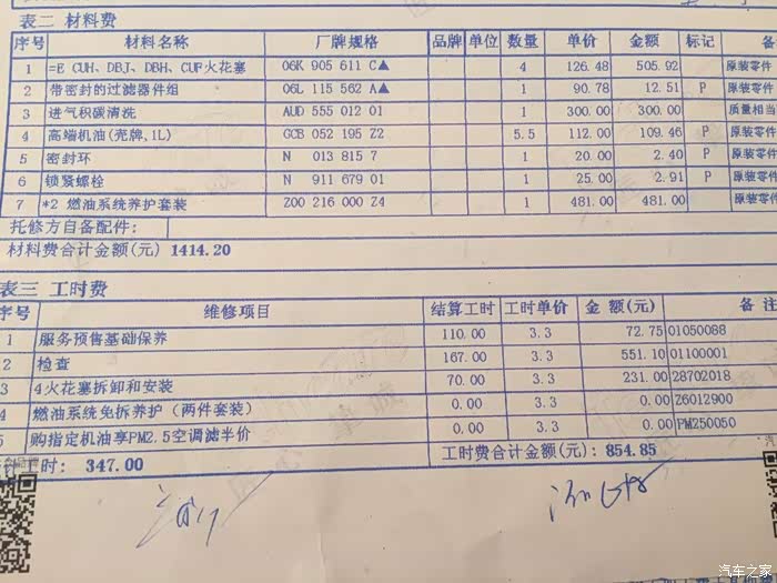 开单按照自己提前做好的保养规划一一列举,这张单子上是常规换油+火花塞的,多了一个油路清洗,大家肯定好奇规划好怎么说变就变了,男人呐!其实是因为搞活动因为换火花塞了,加200元就可以做还不要工时费,省钱何乐不为,平时单材料就要480元工时费另外算。