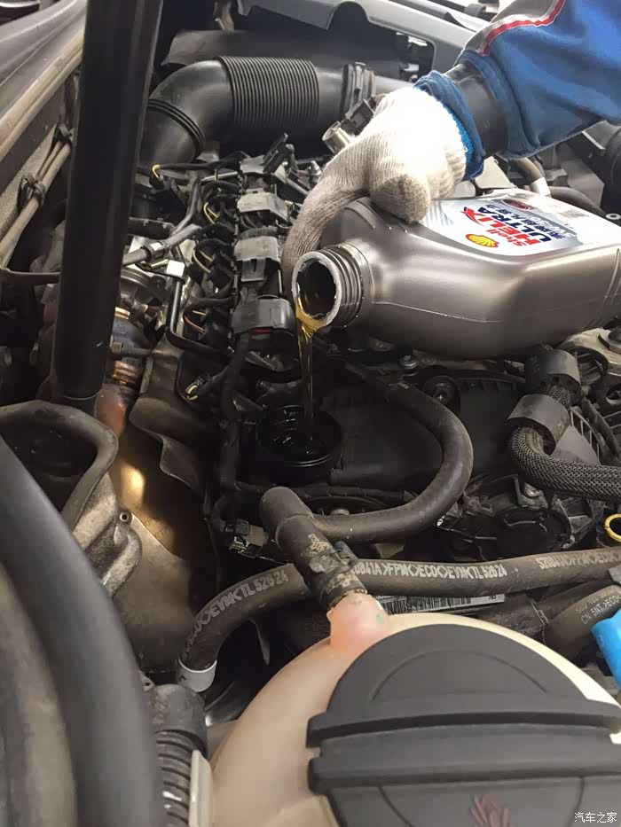 开始注入新鲜的“饮料”了,油的光泽很透彻很亮。5.5L一点不剩全部“下肚”,嗝~嗝~嗝,真舒坦!