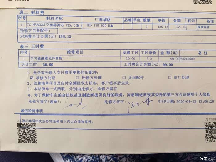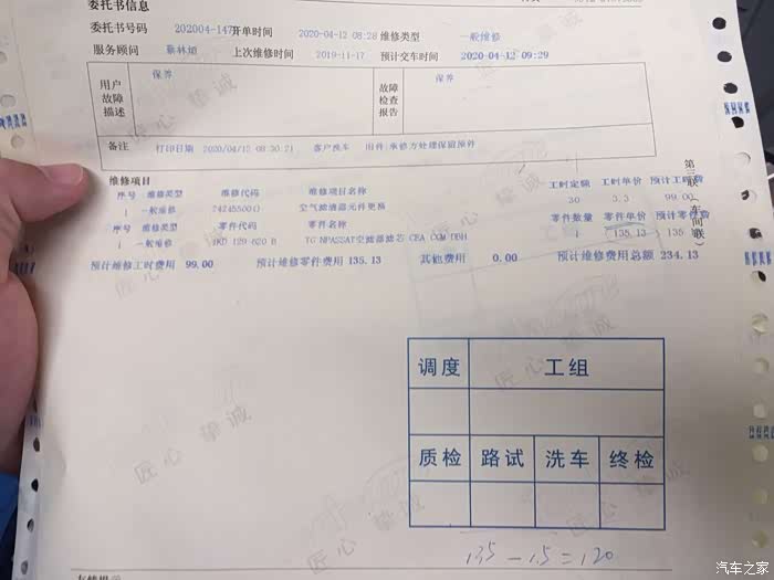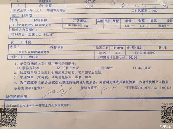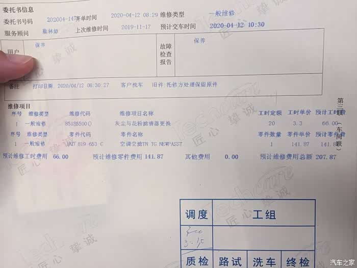 这张是PM2.5空调滤芯更换的单子,为什么开3张单子呢?先卖个关子后面会透露给大家。