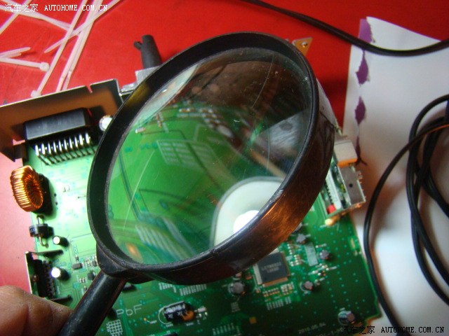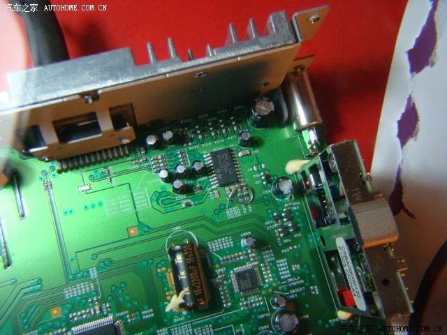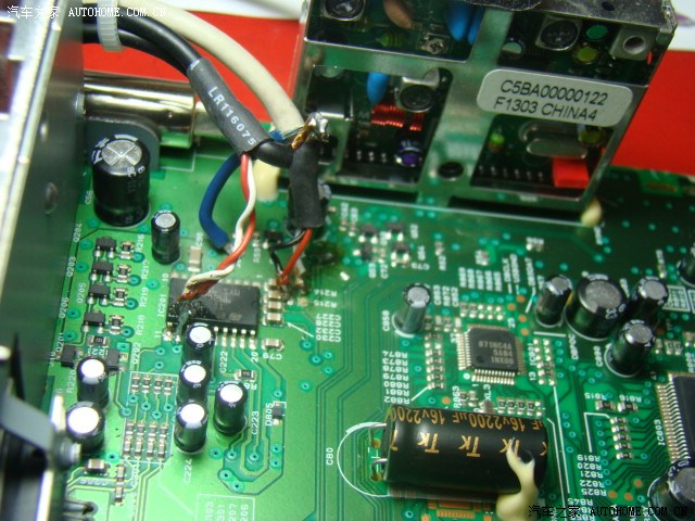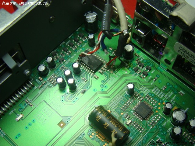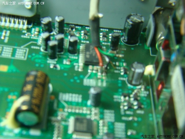 右上方黑色长方块就是音源切换IC,旁边用焊锡丝圈起来的两个小不点是收音机信号输出电阻,马上就要拆除,AUX插孔的4芯线相应焊到两个电阻的4个端点,构成AUX插入式回路