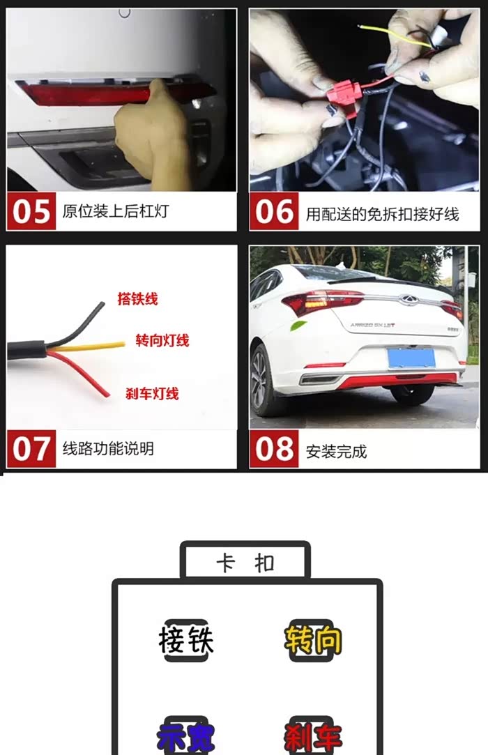 原车后杠灯只是装饰不会亮,今天带给大家我自己动手,改装的LED流水转向灯教程。当然了灯是买的,两三百块钱。去4S店找他们弄,他们说4S店不支持改装,出了问题不保,我就自己动手我花了一个小时差不多。准备工具一个十字螺丝刀,一个尖嘴钳子,一个10号外六角套筒。其他必要材料买的时候都会送的有,我这个是不需要破线,拆装不难,就是研究线卡怎么接花了点时间,商家给的接线口也是完全对的,让4S店师傅亲自测了一遍,我才放心大胆的接好了。身材比较丰满的车主,就不建议自己动手了,因为要爬车底,原车后杠灯由两颗螺丝,和一个卡扣固定的,需要躺倒车底下去拆的。找普通修理店大概工时费50块钱左右吧。动手难度并不高。下面看图详细解。(早上没有吃早餐,就跑到店里弄这个,大热天加上本来就低血糖,装好流水灯,洗完车差点晕过去