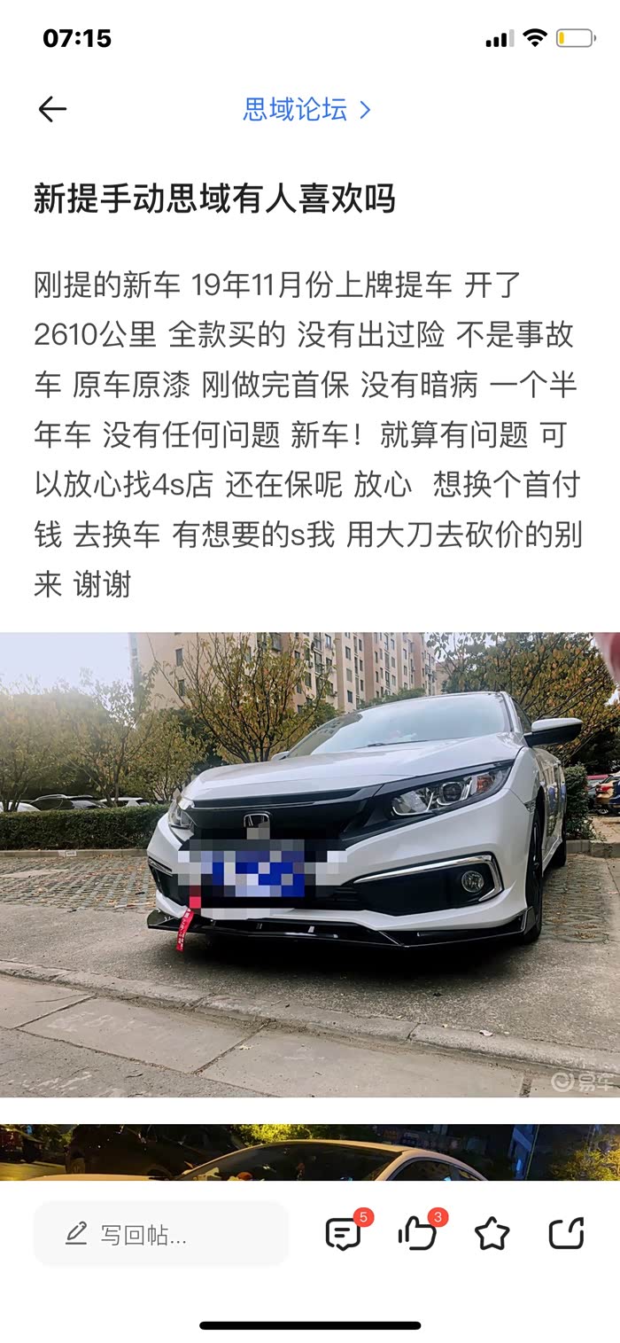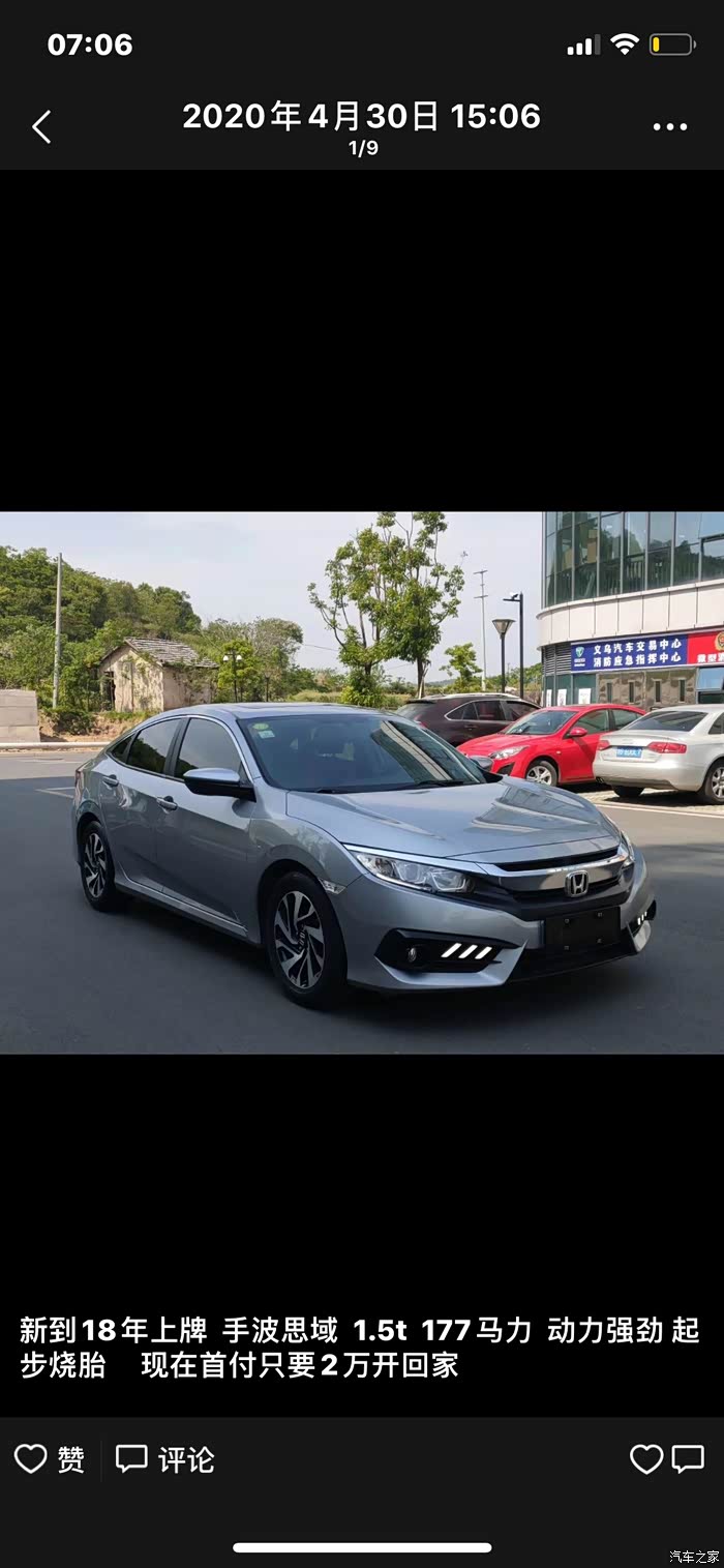 (本人自由职业,很羡慕有稳定工作收入的朋友)所以阿特兹都没有去看过,于是在网上开始找二手车,一开始找的本田雅阁,发现车源特别少,混动更是少之又少,到我们当地的二手车市场逛了下,17年混动雅阁还要卖到17W,车型太保值,阿特兹15W左右,然后车商都希望你分期购买(分期公司有返利给车商)分期购买,自己要承担高额的利息,当时我想过了,如果要全款买二手雅阁或者阿特兹,15W有点不够,不想要年份太老的,两三年车龄都要15W往上。因此我又放弃了买这两款二手车,所以开始在网上看各种评车视频,找15万内有点驾驶乐趣,动力稍好的车,福克斯据说操控是15万内最好的了,网上各种喷质量与做工,又是三缸,于是pass 菲斯塔动力强,但外观无感,接受不了这个鲶鱼脸pass 领克03的外观我很喜欢,但也是三缸,主要还是保养费用高点(没办法,穷啊,各方面都得考虑)最后看到思域手动自动双车的评测视频,种草了,日系车的可靠性,维修保养的经济性,动力也不错,以前在公司开的五菱宏光也是手动,喜欢手动的感觉。于是最终决定购买思域手动。