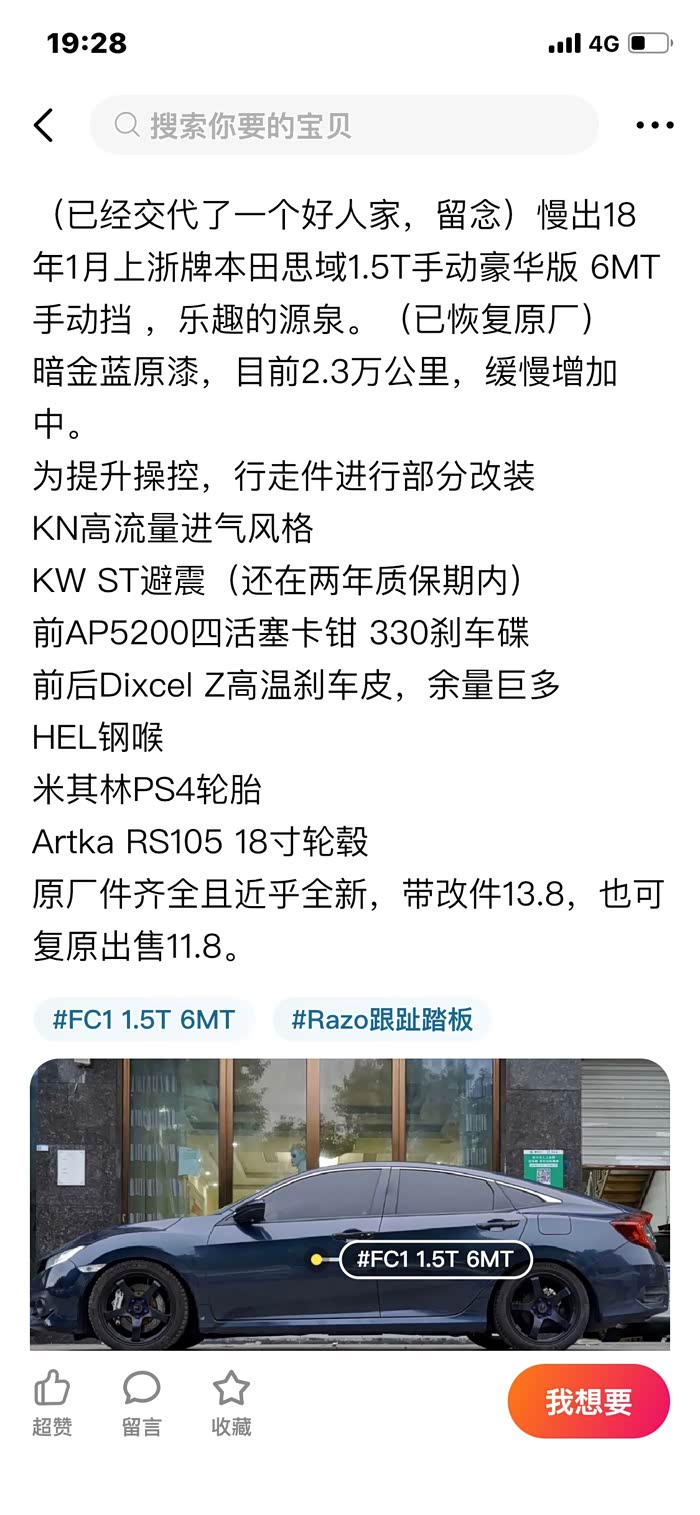 苦逼的我还在租房住,太小,没地方放轮胎轮毂,车主也不急着出,又搁浅……后来和车主聊天得知,他那时候还没想好换什么车,所以不着急。还是想带改件一起出,我当时的想法是如果裸车能出,价格合适10.2左右我就要了,毕竟车商的18年5月份才10.8(车主裸车要价11,比车商还贵