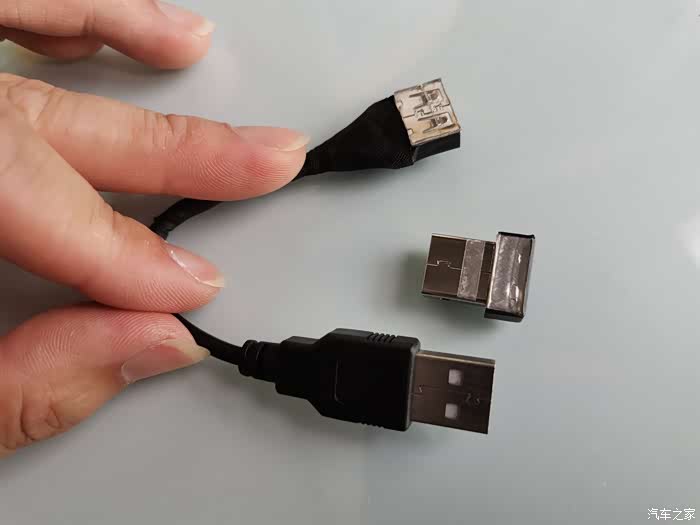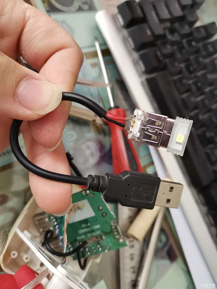 于是在没用的USB扩展设备上拆下了USB母口,在用多余的USB充电线截取带公口的一端,焊接制作一段插氛围灯的延长线