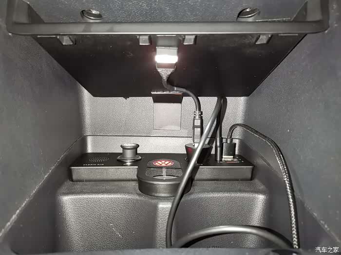 整体效果不错哦!储物格内更加整洁了,但感觉比较黑,于是想在储物格里加个灯,方便在光线暗的时候插充电线和取放物品