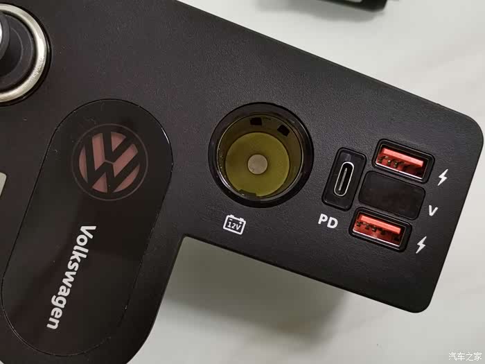 安装上防尘盖,整体做工和细节还是不错的,两个QC3.0USB接口,一个PD快充接口,一个电压显示屏,两个点烟器接口,左边的可以插点烟器点烟,右边的可以取12V电(不能插点烟器,没有隔热陶瓷结构)