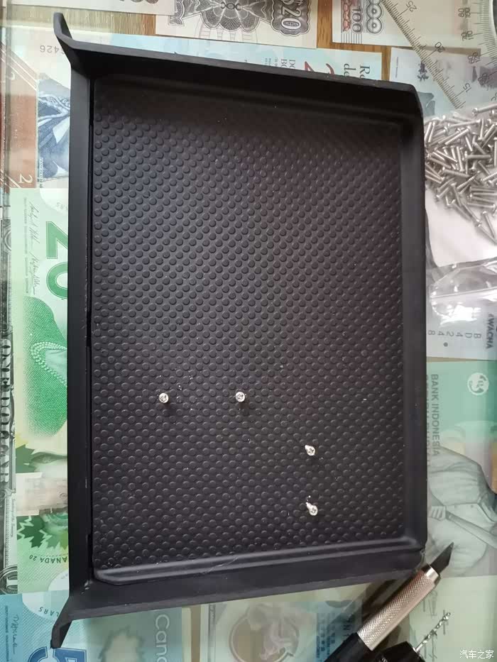 修整打磨过程省略了,车友想一侧放手机,一侧放一盒细烟,但细烟烟盒比较短,容易掉进去扣不出来,于是,用M2*10的平尾自攻螺丝,按照烟盒尺寸打孔拧了四颗,拦住烟盒防止滑落