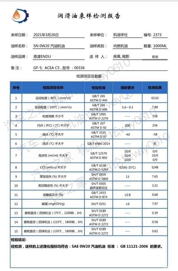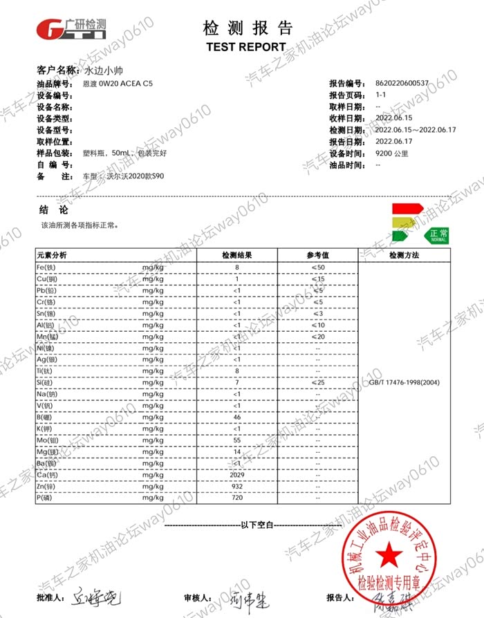 9200公里的恩渡0W-20废油全元素分析,报告来自广研检测,是国家认可的检测机构