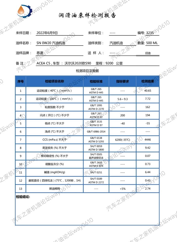 送检废油样品,9200公里的恩渡0W-20 C5