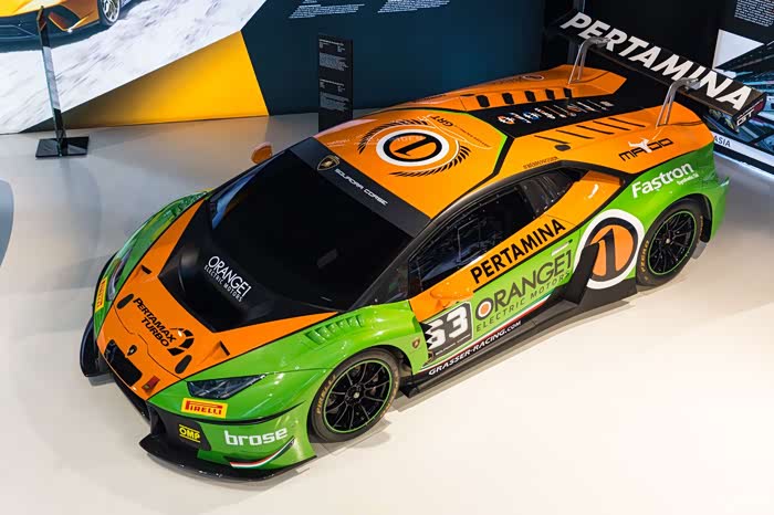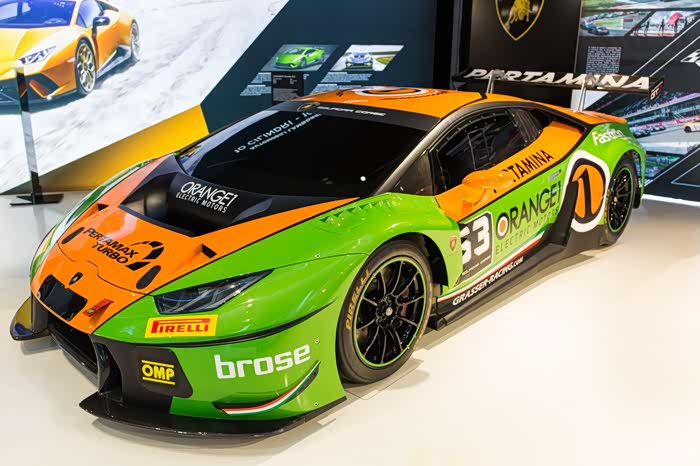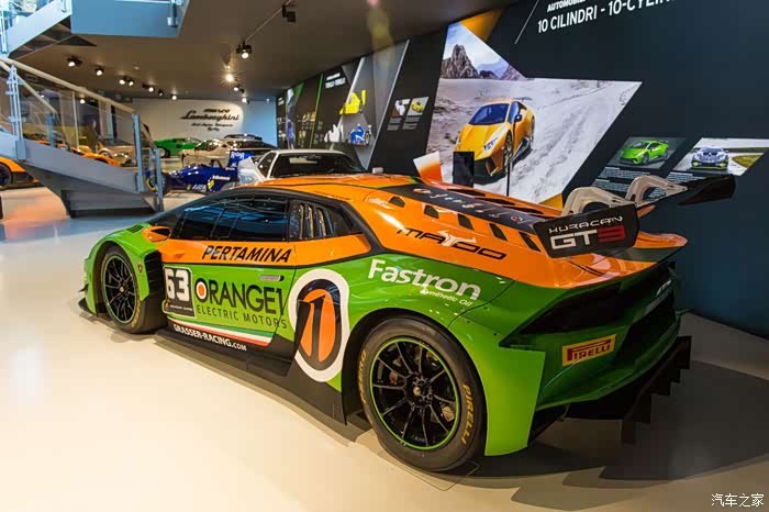 和 Performante 并列摆放的是一台2015年款 Huracan GT3 ,这是首台由兰博基尼圣·雅卡达中心独立研发的 GT3 赛车,2015年在意大利米兰 Monza 赛道首次亮相。