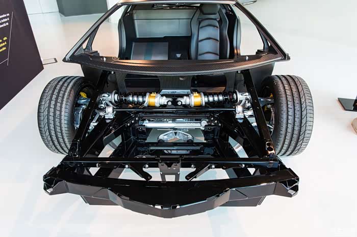 车头可以清楚看到横向推杆水平悬挂结构,这样的悬挂通常用于方程式赛车和部分高性能超级跑车上。