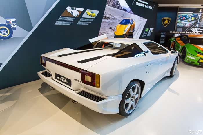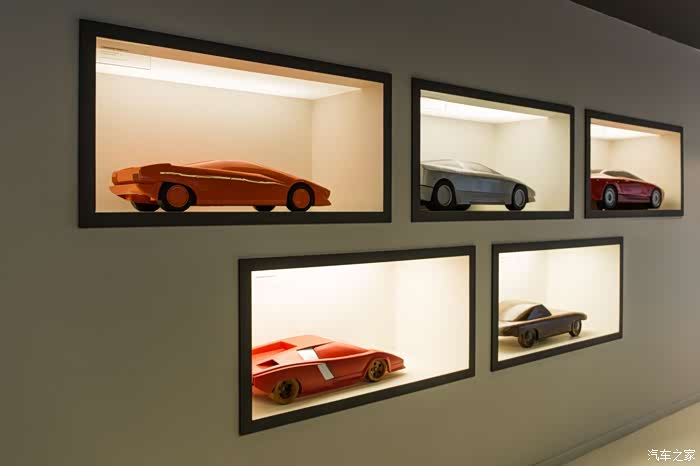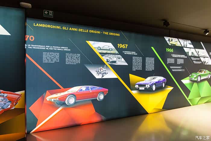 从售票处前往展厅的走廊上展示着兰博基尼发展的历史。