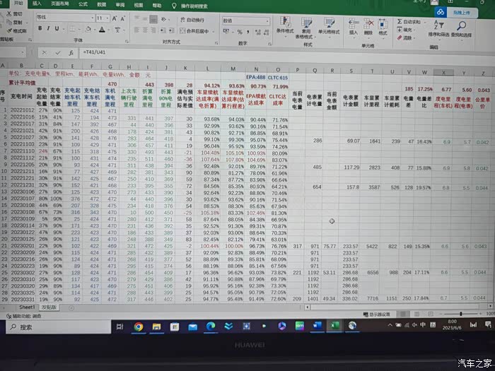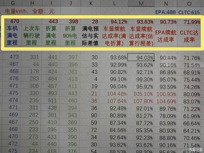 这个数据出来后就好计算各种口径的续航达成率了,首先是车显续航里程达成率,我理解的车显续航里程是指大屏顶上所显示的预估里程(可以和电量百分比切换那个)。要同口径比较,所以先要根据充电结束后的预估里程与此时电量百分比换算成100%电量下的预估续航后,再与折算满电续航进行比较即得。另外一个思路是实际行驶里程与预估里程差相比较,即充电结束后预估里程与下一次充电前预估里程的差值与实际行驶里程进行比较,两个数据虽有差异,但差异却不大。还有一个就是EPA续航达成率,前面我说过,论各种续航标准,目前我只服EPA,所以专门进行了一个比较,YP的EPA续航数据是303哩,折算为488km,折算满电(100%)续航里程与之一比就得。虽然极度讨厌CLTC标准,但还是顺手做了个达成率计算。