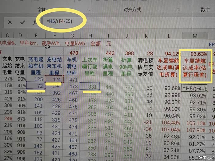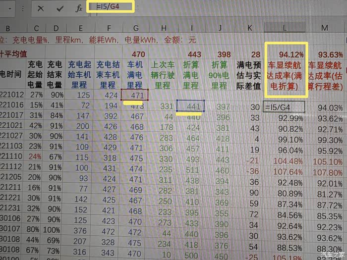 3、用满电量预估与折算行程相比计算出的车显续航达成率:94.12%