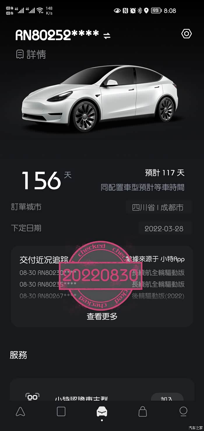 然后又是等待,时间流淌到了2022年8月30日,156天之后,从成都龙泉的特斯拉交付中心顺利提车。提车过程也非常简单(尾款支付与保险购买已提前办好,保险是人保的,大概7.5K左右),老婆没去,我叫了单位一个同事开车送我到交付中心,有条不紊,流水线作业,拍张打卡照,交待了注意事项,把手机钥匙配对激活,连大名鼎鼎的特斯拉雪饼与可乐我都没看到,更没吃到与喝到,同事开来的车,我自己开新车,调成“保持模式”就回单位了。接下来几天,专门在网上选了个毫无辨识度,毫无存在感的无字母全数字牌照号,一切ok。