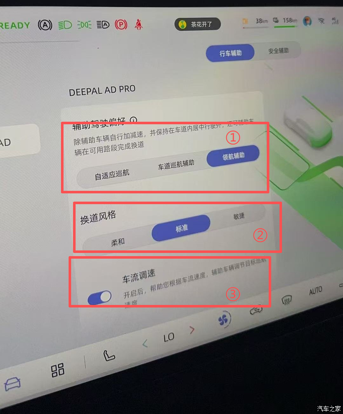 该功能仅在高速或者部分城市快速路上可以打开,需要把原先的智驾模式偏好设置成【领航辅助】,碰到可以打开的路段会使用该模式,如果不行则降级为车道巡航辅助,如下图1的第①个功能设置