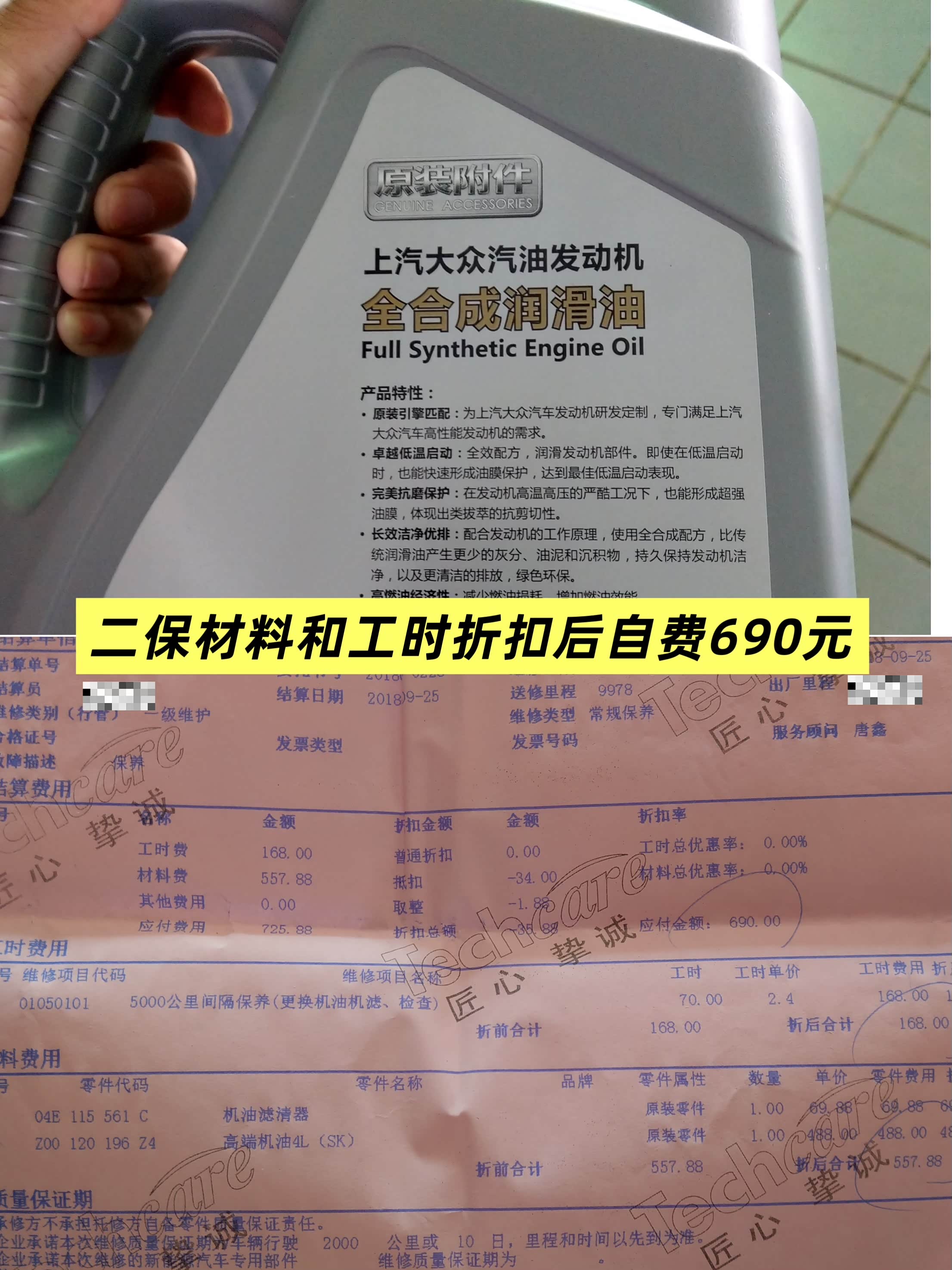 保养的流程还是一样,更换机油和机油滤芯,只是二保的机油更换成全合成的了,费用是自费的,材料和工时费折扣后付了690元。