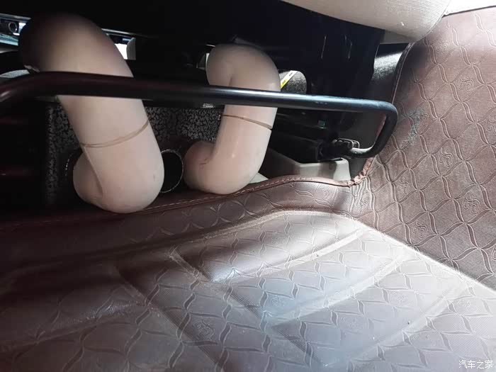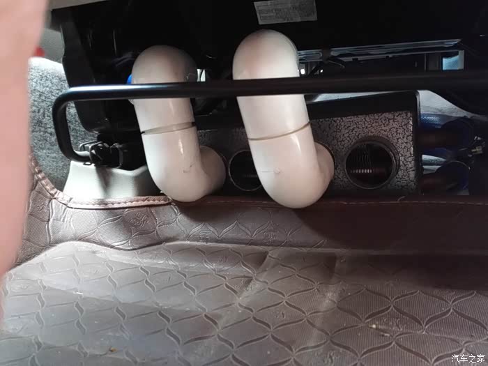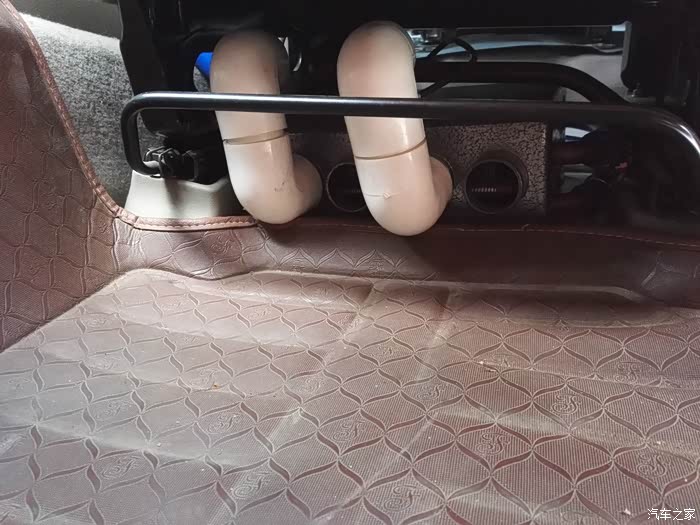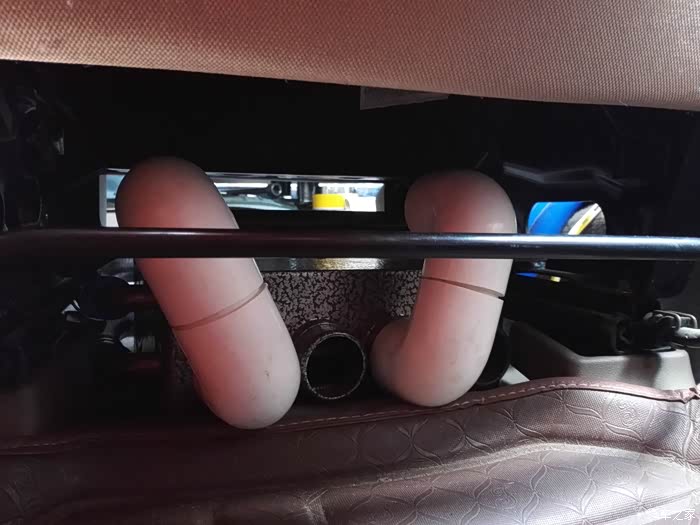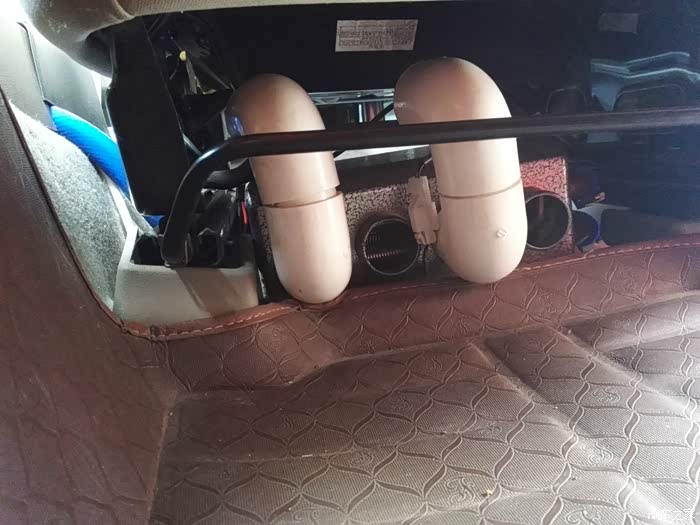 副驾驶座椅下面,前往后拍摄的,水暖风机,一共四个出风口,有两个用PVC管子把风引到后面,