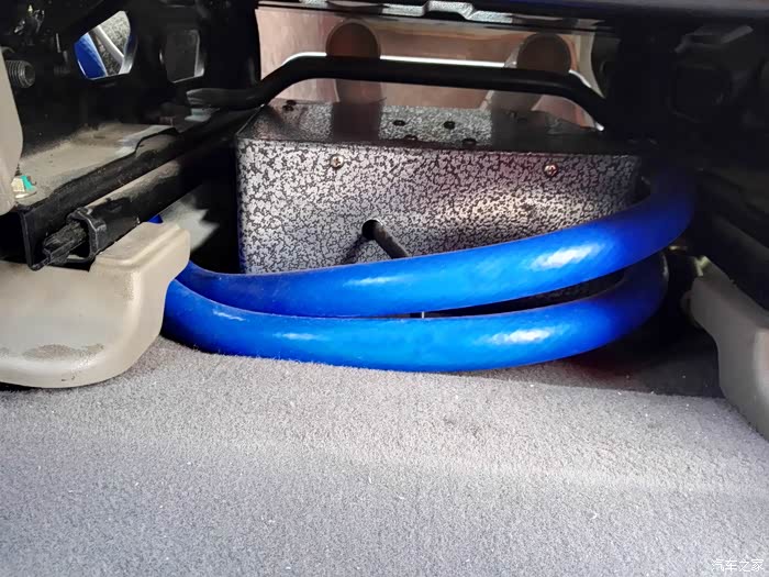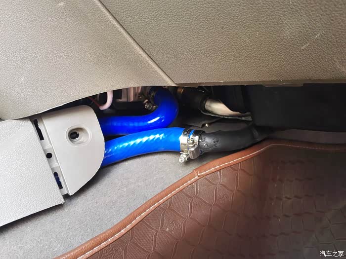 蓝色的管子是硅胶水管,昨天才换上的,之前是黑色的橡胶水管,卖家告诉我几天就没味了,结果,头两天降温,我把发动机的给小水箱供水的开关打开了,水温慢慢上来,橡胶水管的味道也慢慢上来了,其实我早已习惯这味道,就是孩子闻道这气味就晕车