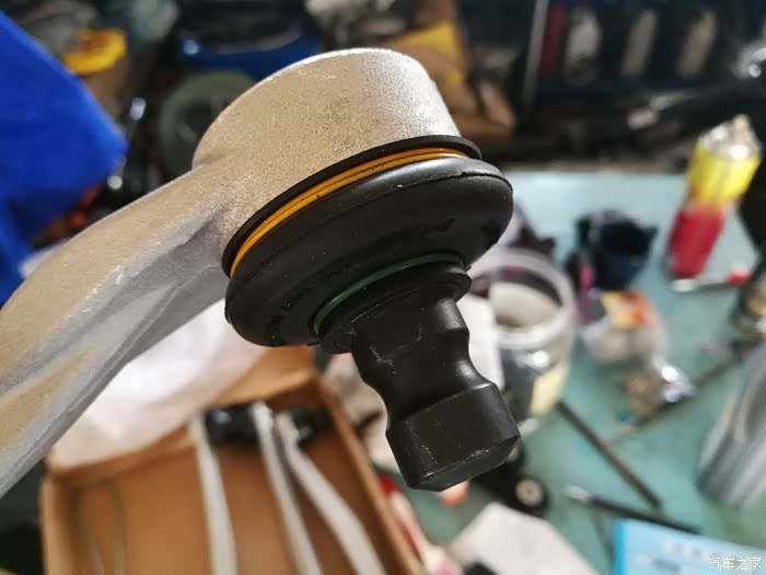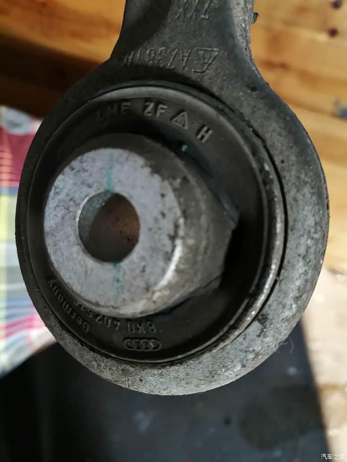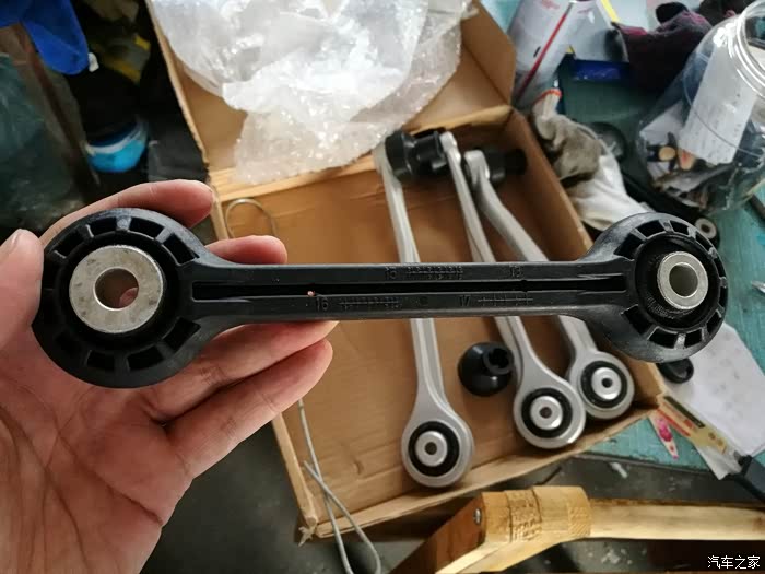先从换悬臂开始,起车,下轮胎,就露出悬挂的真面目,其实悬挂出现松散的关键不是因为悬臂的金属件出现问题,大多数是由于悬臂上得橡胶垫老化,造成破损,影响到了整个悬挂的使用质感。一般情况下,橡胶的寿命要比金属短很多,所以选择好一点的副厂件就基本满足使用需求了。另外最坑的是,因为橡胶垫成本较低,但压进悬臂的工艺却比较复杂,所以市面上只有购买整根悬臂,而不能只更换个胶套。换下来的旧悬臂都是德国产的,胶套上有明显的破损,这些破损造成了悬挂品质的下降,底盘的松散和异响。
