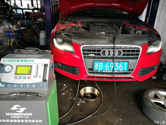 更换完悬臂,就开始换机油了。操刀的是一个老师傅,他告诉我,奥迪CVT的变速箱油换起来很麻烦,曾经有辆车用循环机换了18升的油都不干净,必须用他的小窍门才换的干净。
