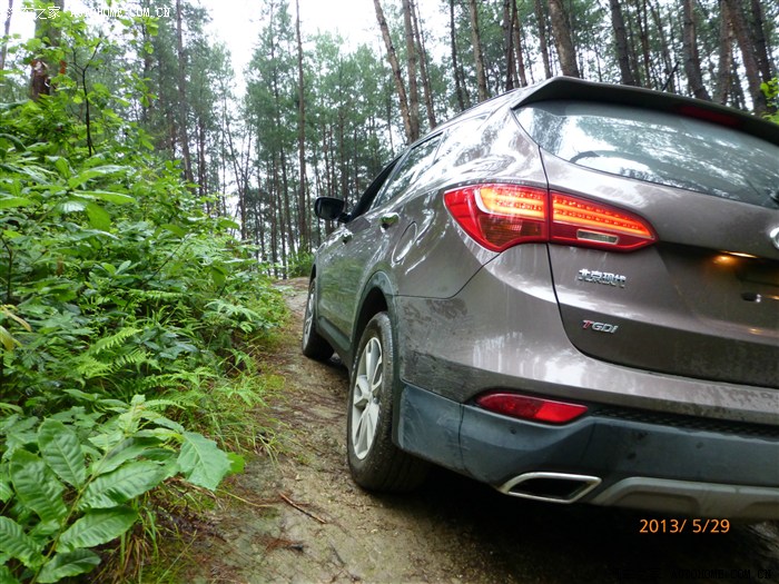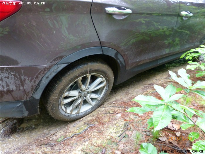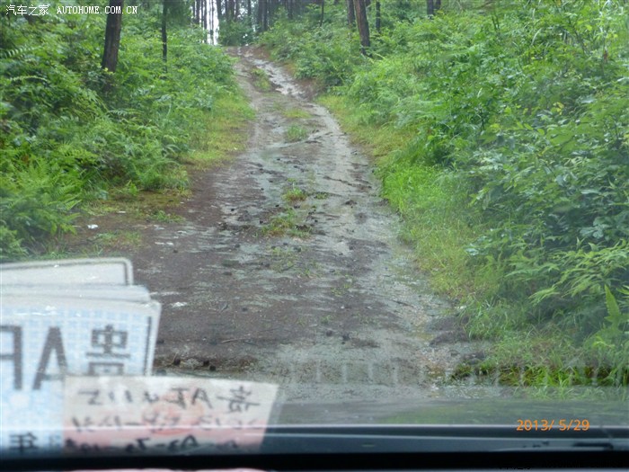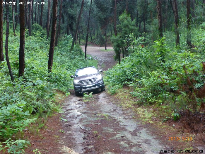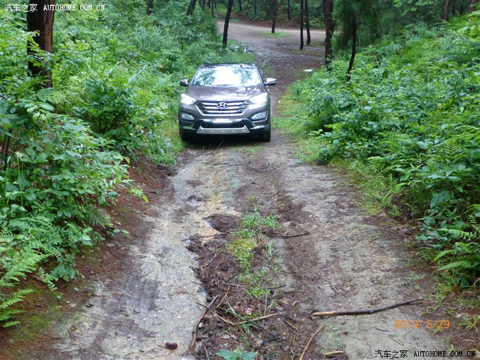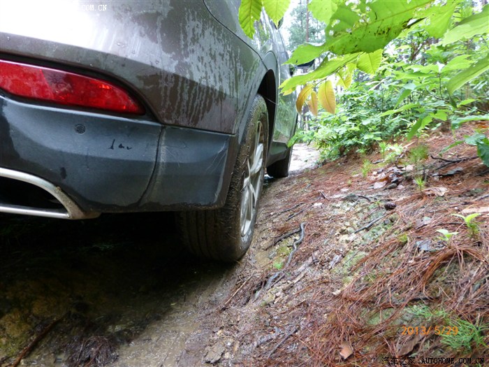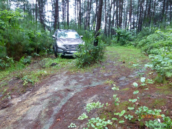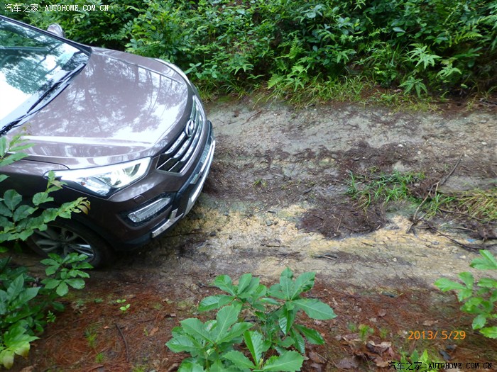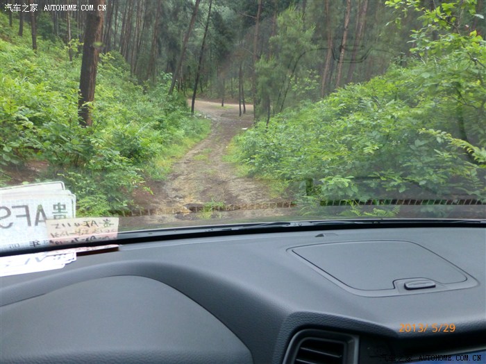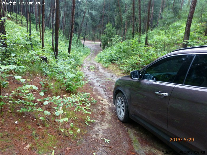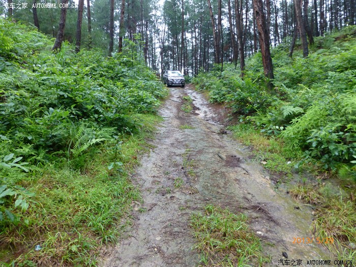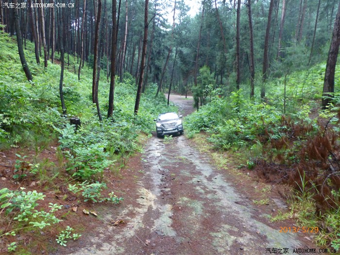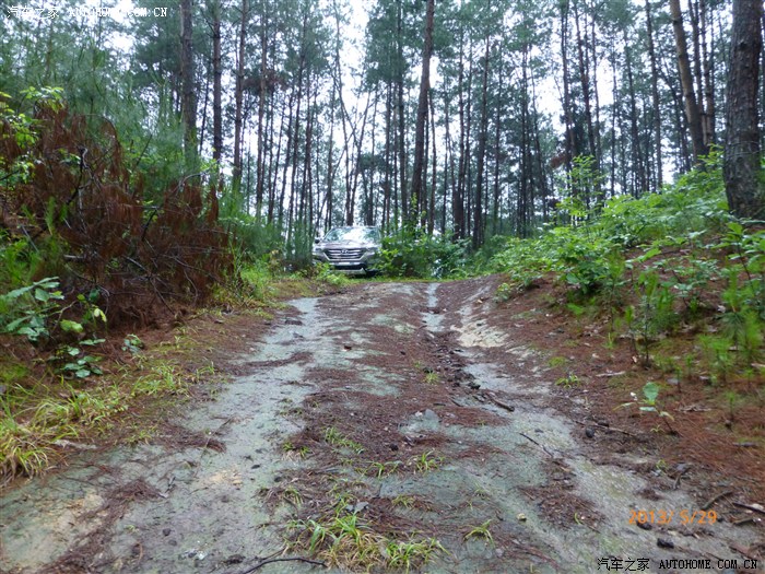 5月29号,瓢泼大雨从半夜一直持续到中午,13点左右逐渐停止,当天下午没什么工作,于是驾驶达达到了郊区一个荒无人烟的丘陵地带进行四驱测试,测试的道路坡度大约30度,坡长60米左右,道路属雨水冲刷后自然形成,路面凹凸不平且有几个大坑,测试开发后达达不怎么费力的用两驱到达了坡道的中间路段,选择一个有坑的地方停住后重新起步,前轮开始打滑,停住后接通四驱,再起步,达达没让我失望,顺利的到达了山顶,掉头后,下坡就非常简单了,到了坡道的中间,停住,打开陡坡缓降开关,挂D档,松脚刹,呵呵,车车并没有像我们想象的那样慢慢下去(比使用脚刹自己控制快多了),感觉到ABS介入后咯咯作响,车速可能有7-8公里每小时,着实吓了一跳。上图: