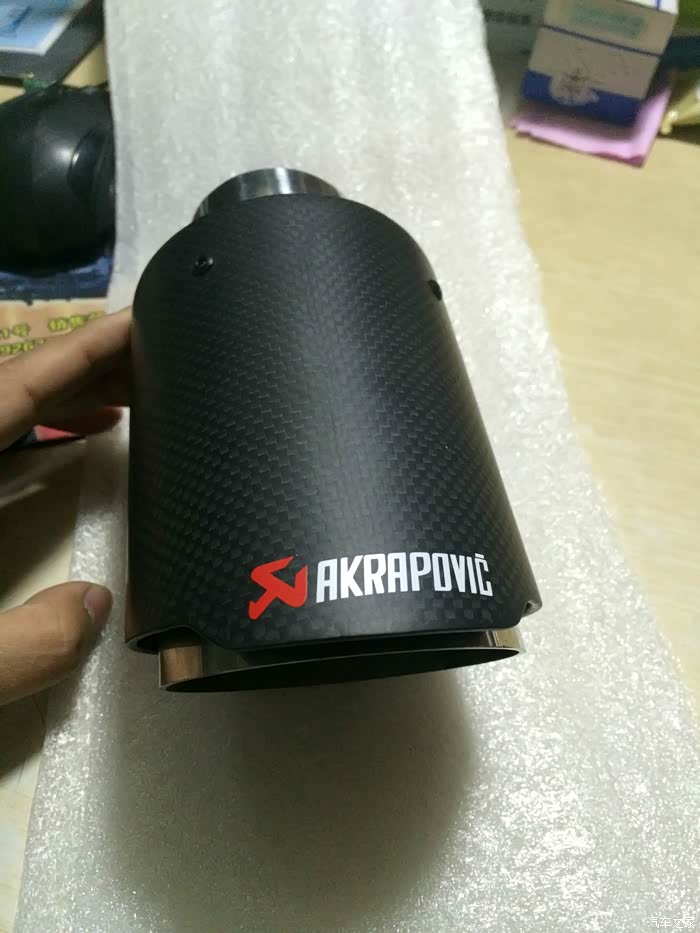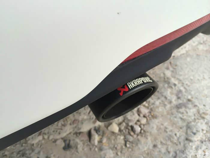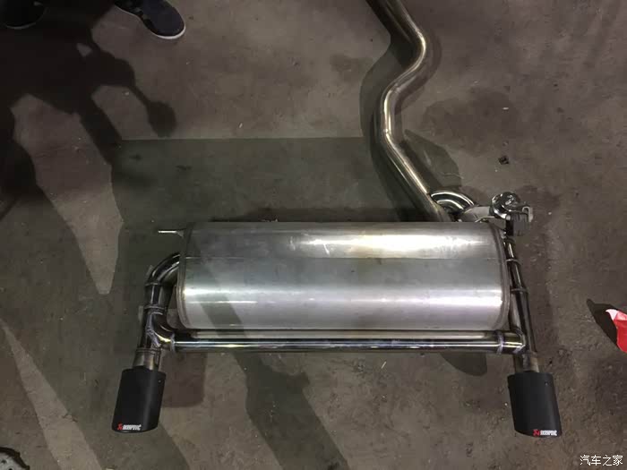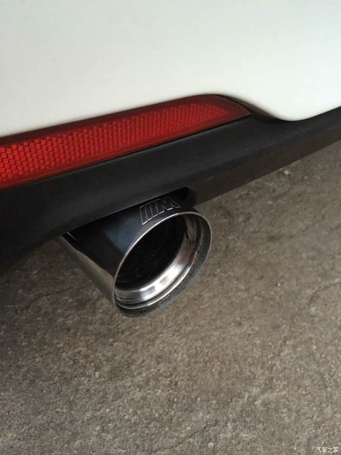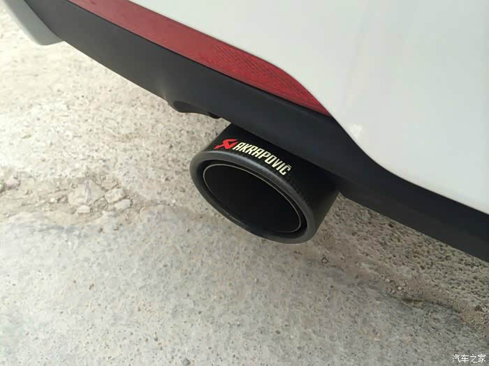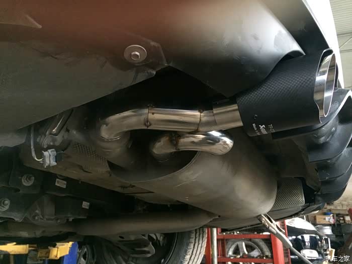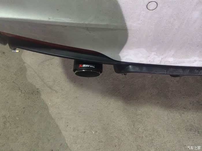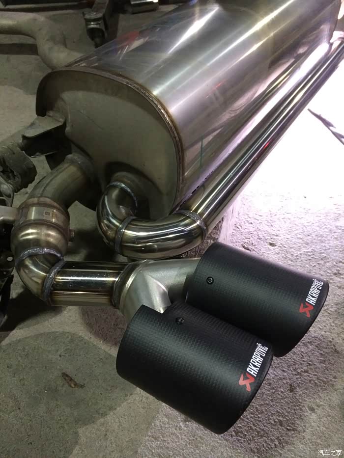 实拍效果图,原厂排气尾段也是不锈钢的,而且用料厚实,质量不错。左右两边的尾喉都是一样黑黑的,说明出气均匀,因为排气是直接在车上和包围一起定位的所以安装比一些个大品牌的都完美。这里就是定位很重要,装歪了就难看了。