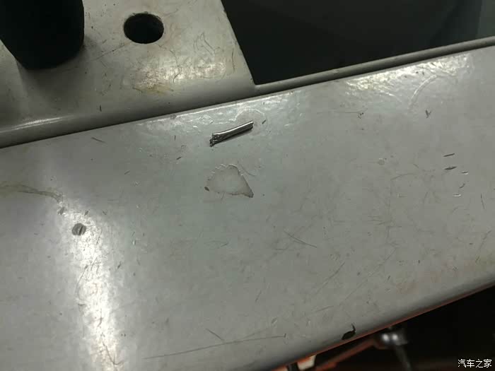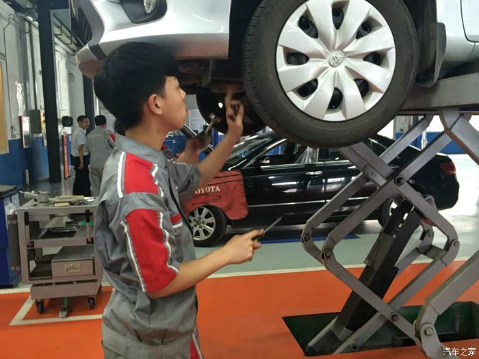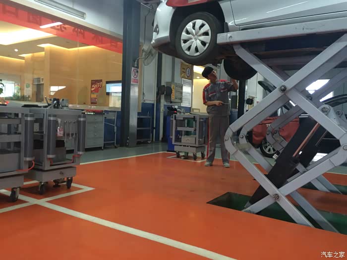 升起来检查轮胎,还真查出来个问题左后轮胎扎了个小铁棒,还好没漏气,小师傅检查的都很仔细,工作很认真