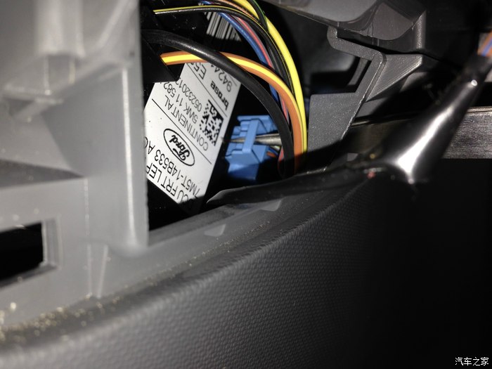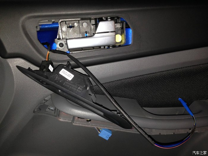 从车门拉手位置穿出 继续从车门拉手位置开始穿线 从车门扶手下部穿出 靠重力很好穿 不需要铁丝引