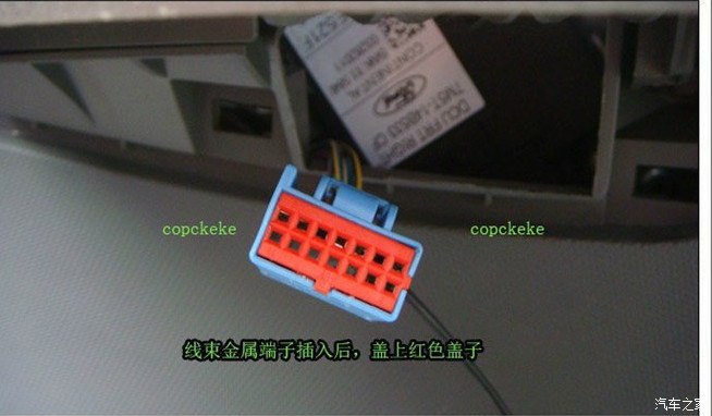 装到这里出现了一个问题,在盖上红盖时候盖不紧,在把蓝插头插回车门电脑时没有卡到位,检查了很久,终于发现,由于5号端口的端子并不是原厂的,长度偏长而且缺个卡位,只能将红色盖子上对应的5号压边处截掉一小段,红色盖子终于归位了。