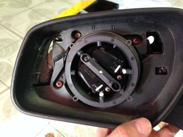 拆下镜片的后视镜 电机座上4个带圆孔的耳朵 就是刚才说的突起 用螺丝刀卡在此突起和镜片之间向后视镜方向用力,同时往后掰后视镜 稍用点力就卡子就脱离底座了 用好力道拆下镜片后卡子肯定没问题的。