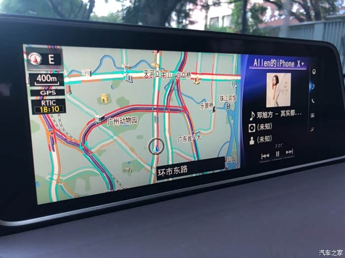 原车导航系统,带实时堵车信号。红色代表堵车非常堵