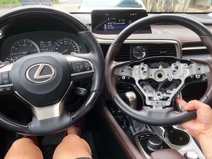 换上后的效果,手感达到了一流的效果。由于我们方向盘的缝纫线石暗红色的,LX的是灰白色的,所以废了原来皮的方向盘把线转移到了新的盘上,这个很考手艺,需要经验丰富的师傅才能换的好,不然容易废,