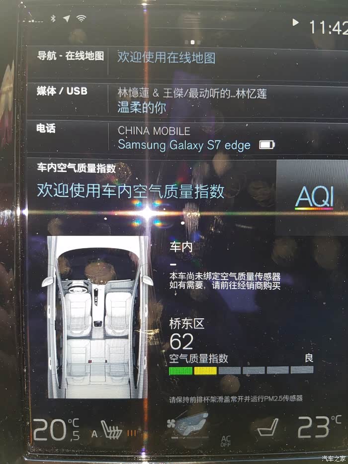 AQI,是一个在线的APP,它所显示的外面温度也是通过互联网的数据,并非S90实测。90原车自带IAQS当外面空气污染时,会自动关闭进气,实现车内空气内循环,但是CZIS有四年的使用期限,所以我认为没有必要再去绑定空气质量传感器。