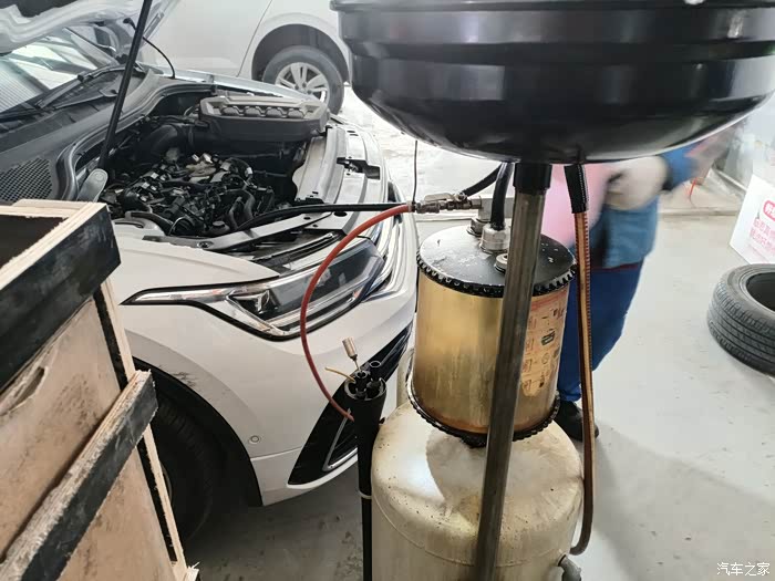 1.机油更换。这个大家在选择的理由一定要和工作人员共同好到底要用什么理由,我本来准备用黑钻全合成,预约的时候也和师傅沟通过。但是到店之后,我只说了一句全合成,少说了个黑钻,结果换的是全合成机油(高端级)的不是黑钻。言归正传,首先师傅将车停至维保工位后,打开引擎盖,利用专用机器将原车机油抽出来,洗干净,最后打开新机油包装直接加注,盖子拧上就结束了,这也就是首保最重要的一步。