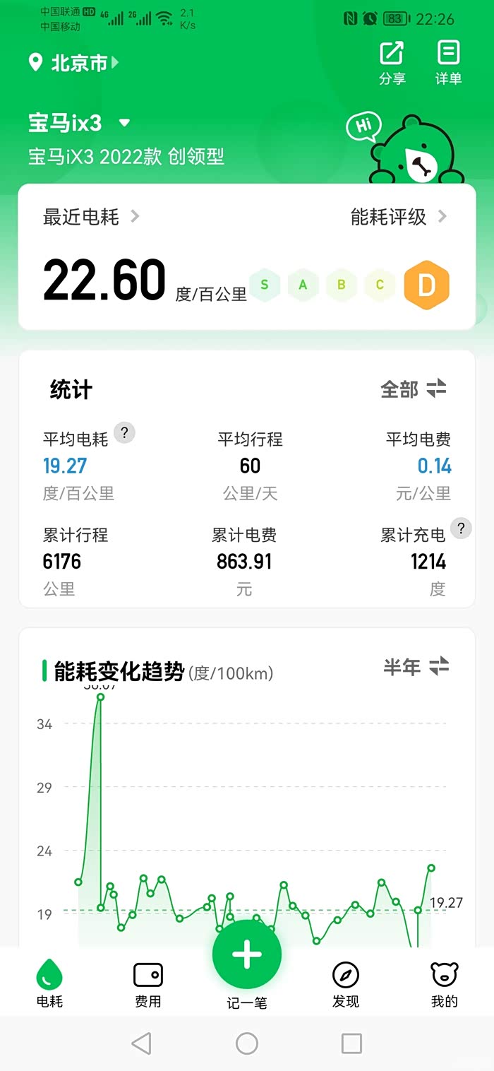 纯电车,三个月出头,六千多公里,头一个多月都用的商业快充,比较贵。家用充电桩的话,每度电0.473,大概也就是每公里0.09元左右