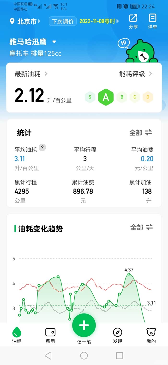 日常买菜小摩托,开的少,四年才四千多公里,每公里0.2元