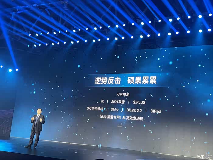 王总介绍了2020比亚迪在疫情期间转产口罩, 逆势反击, 硕果累累, 推出了刀片电池的汉, 2021款唐, 宋PLUS, SIC电控模块, 骁云-插混专用发动机等等新产品和技术,