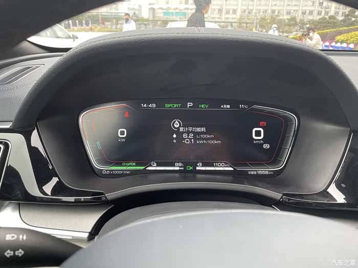 一上车就寻找DM-i的标志性辨别方式, 仪表盘中续航超过1000公里的指示是相对于其他DM-p车型最明显的区别了,