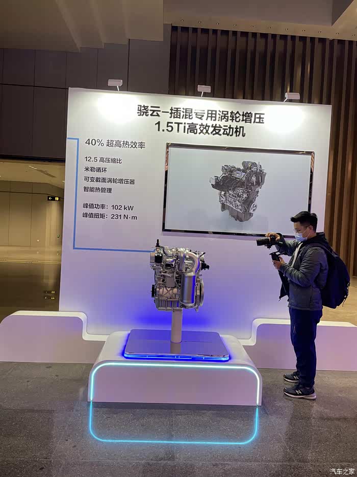 骁云1.5T插混专用高效发动机热效率可达40%, 采用了米勒循环工作模式, 压缩比12.5:1, 带有可变截面涡轮增压器, 最大功率139马力, 峰值扭矩231牛.米,