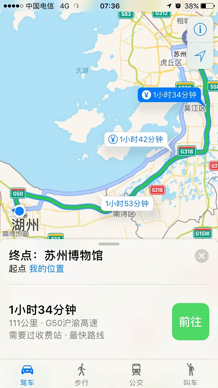 本次从湖州出发,直接到苏州博物馆,行驶里程地图显示111km,收费站收费单程一共是50,大概一个半小时就可以到了