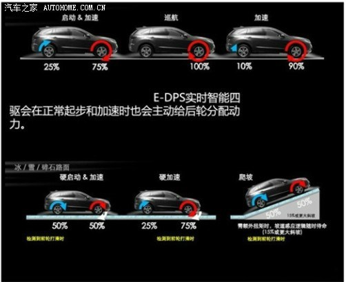 而13款的AWD四驱,是与外国市场一致的四驱系统,是由电脑实施控制扭矩分配,且最大扭矩分配达到50:50。具体有以下工作模式: