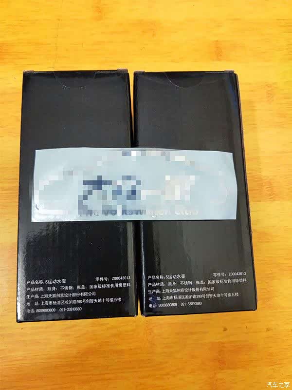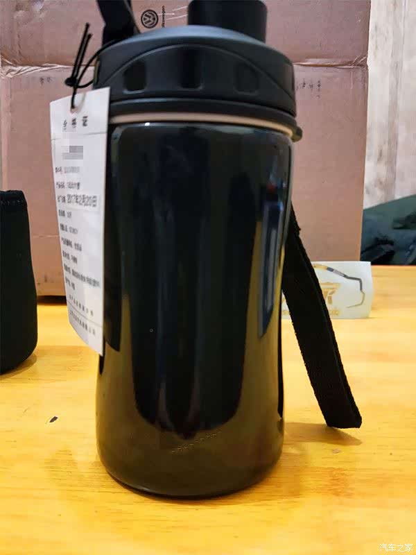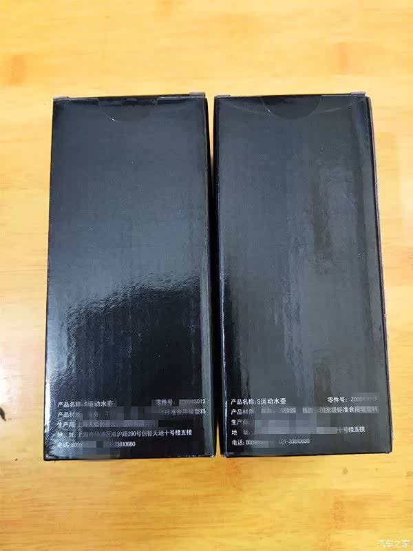 运动水杯的包装盒通体采用黑色为主色调,正面靠近下方标注了产品的名称,型号,生产厂家等信息。