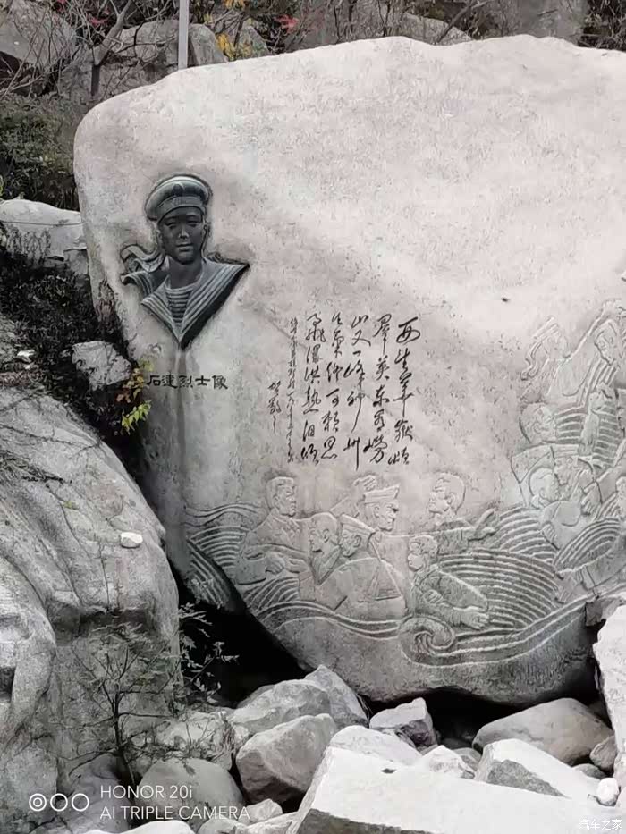 下图中石崖上那尊海军的浮雕头像,他叫石建,是海军航空工程学院 青岛 校区的一个班长,为了救人在这里献出了年仅19岁的生命。【1985年5月4号,包括石建在内的原驻 青海 军第一航空机务学校的新学员们,在学校组织下集体到 崂山 游玩。刚上山时,山里下起了小雨,中午过后,雨越下越大,一场山洪随之爆发。大批群众蜂拥到漫水桥上,争相往山下逃离,见状,附近的石建、葛茂进、刘玉壮等战士立即冲上漫水桥,搀扶游人过河。正当石建侧身准备接应女工李华时,李华突然踩空,落入深水中,石建也毫不犹豫地跳进湍急的河水中。随后李华获救,而石建自己却被卷入了更深的漩涡中,后来,人们在下游大石缝里找到了他的遗体。。。。。。】向英雄石建致敬