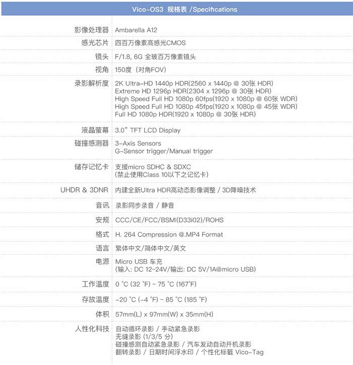 全新安霸A12晶片,效能提升至2K 1440p ,画素逼近两倍1080p,搭载Ultra-HDR(之后简称HDR)功能,150度大广角,F1.8大光圈镜头,400万高感光CMOS提供了完整的行车安全保护。另外Vico-OS3是6G百万像素镜头,G是glass,玻璃的意思,6片玻璃的百万像素镜头,在高温下不变形,同时镜头还可以加装30mmCPL镜环减少前档玻璃内反射,使之有更清晰的录像。