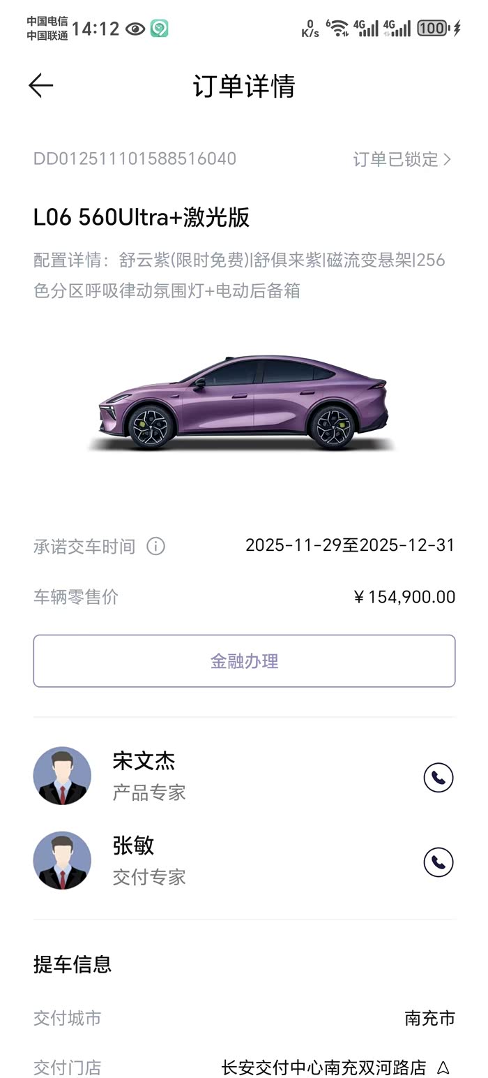 #深蓝L06新车主,18号发布会过后终于定了深蓝L06内外双紫的560ultra+激光版。11月7号左右去看车,本来预计在启源A07与深蓝L07中选一个。结果去启源试A07的时候看到A06也试驾了,总体感觉还行,就是A06的外观个人觉得难看,还有就是电池。然后去看了深蓝L06这个车太让我心动了,外观:科幻、犀利。内饰:简洁、大方。动力:强劲、顺滑。尤其是那个磁流变悬架真的是稳如老狗。我平时虽然不特意跑麋鹿,但是关键的时候不能没有这个功能(往小了说能降低事故,往大了说能救命)。再加上副驾驶的零重力座椅,有时在车上小憩一下也是个不错的功能。特别赞的是半隐藏机械式门把手,即好看又安全、稳定。男人至死是少年,总有一个年青的心去选择深蓝L06.