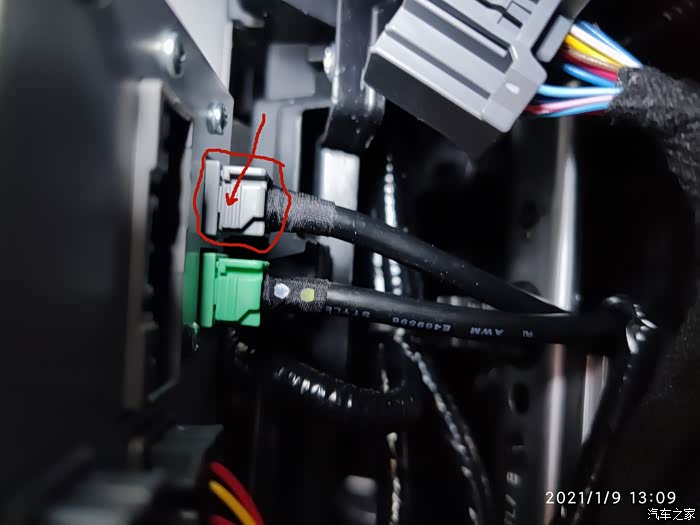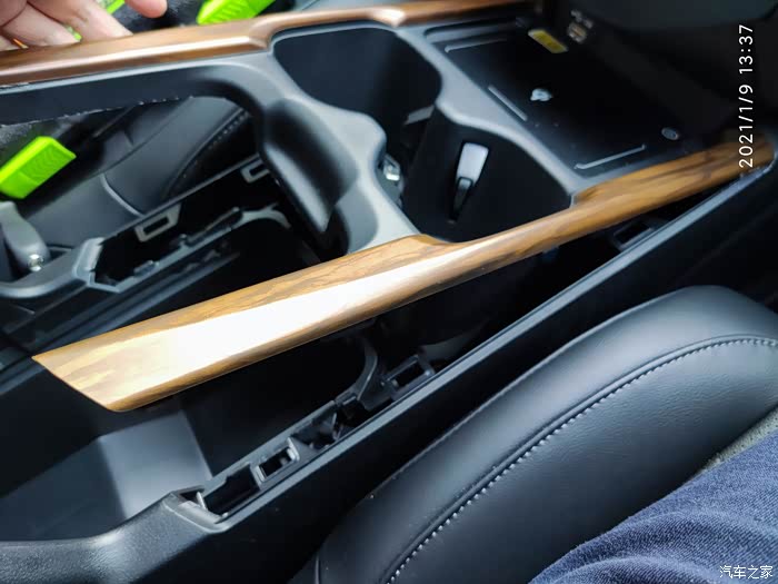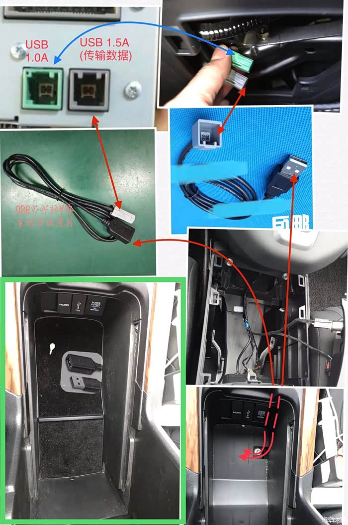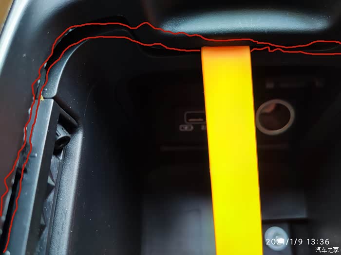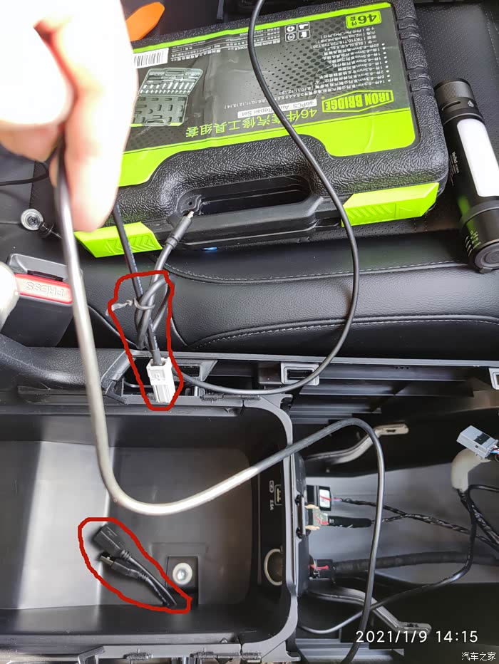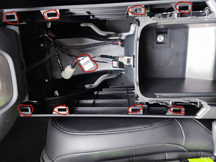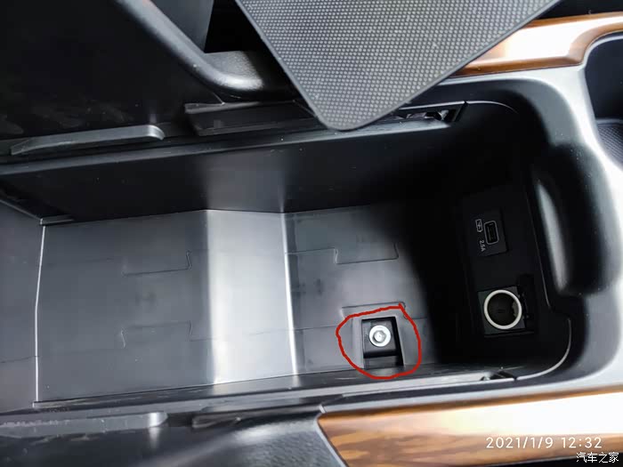 把前面扶手箱的底层隔板拿掉后,可以看到扶手箱下面有一个洞,这样上面两个线的就可以不用打洞就可以接入到扶手箱中了。