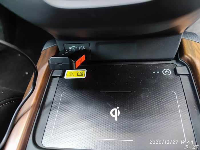 在排档下方,无线充电板的上方的,USB1.0A的接口,把USB接收感应器安装好,就可以显示胎压情况了。