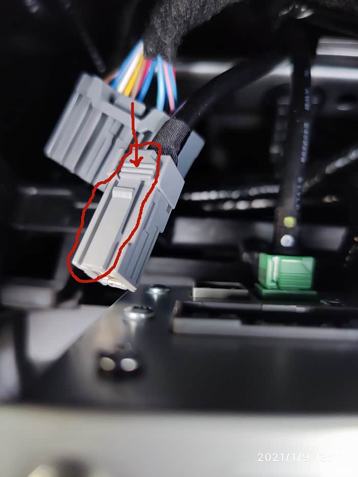 这个就是我们目标线束,灰色接口,看红圈部分,注意箭头指着的地方,这是卡扣,必须按住这里才可以拔出来