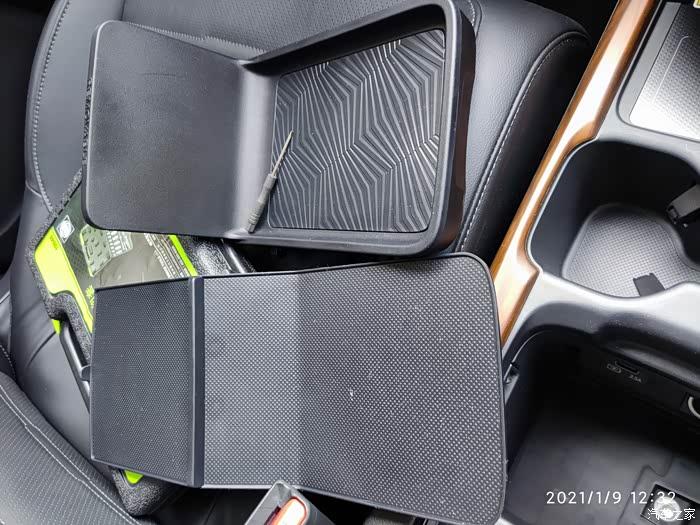 上图下面的板子,就是拿掉的扶手箱的底层隔板,就是一具塑料的硬壳板,很方便就可以拿出来